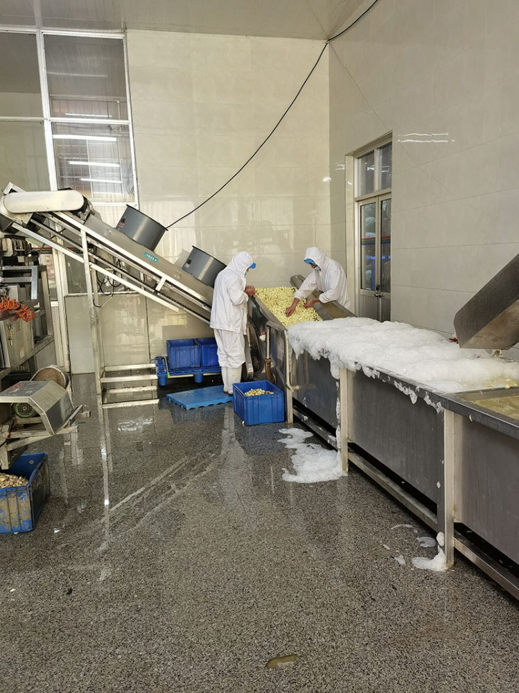 再漂洗:將切好的蒜片隨即導(dǎo)入竹筐內(nèi),在流動(dòng)的清水中充分漂洗,出去膠液和碎片,以利于烘制。漂洗不充分烘干時(shí)會(huì)造成黃褐色。